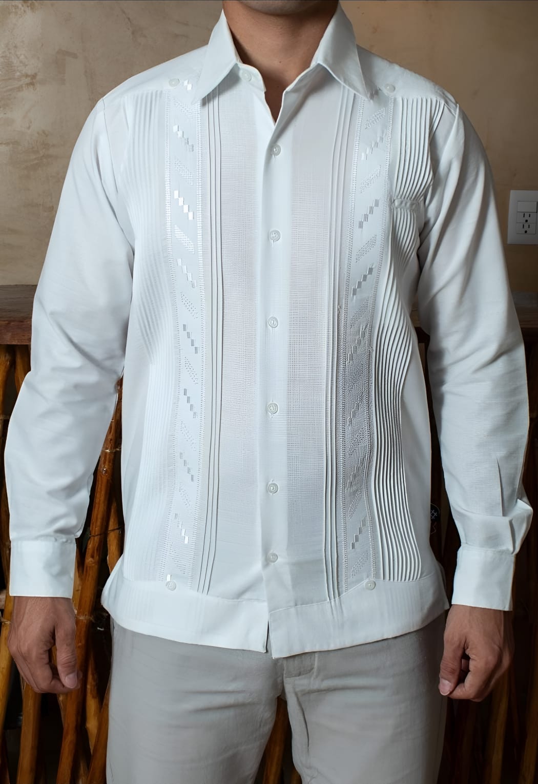 Elegancia y distinción en cada detalle. Confeccionada artesanalmente en Mérida, Yucatán, esta guayabera destaca por su corte clásico, bordado fino y textura ligera que refleja la tradición y el estilo del hombre moderno. Ideal para ocasiones formales o eventos especiales, representa el orgullo del lino y la elegancia yucateca.